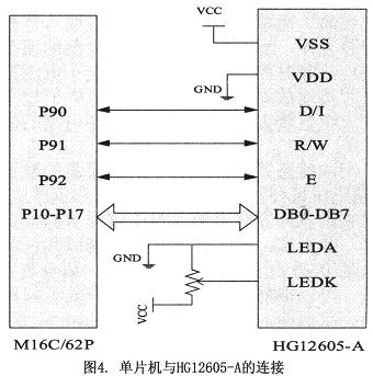 HG12605-A中內(nèi)藏ST7920點陣式LCD控制與驅(qū)動芯片,可以顯示字母、數(shù)字符號、漢字、以及自定義文字符號。ST7920芯片內(nèi)部集RAM和ROM、字型產(chǎn)生器、以及液晶驅(qū)動器和控制電路于一體,因此,只要一個很小的處理系統(tǒng),就可以操作HG12605-A液晶顯示模塊,并且硬件連接簡單。液晶模塊和單片機的連接如圖4所示。