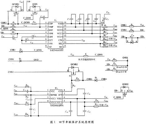 該保護系統(tǒng)采用精工電子三/四節(jié)串聯(lián)鋰離子可充電電池專用充、放電保護ICS-8254構建一級保護。S-8254系列內(nèi)置高精度電壓檢測電路和延遲電路,針對各節(jié)電池進行高精度電壓檢測,實現(xiàn)單節(jié)過充電保護和單節(jié)過放電保護,并具備三段過電流檢測功能,通過外接電容可設置過充電檢測延遲時間、過放電檢測延遲時間和過電流檢測延遲時間1(過電流檢測延遲時間2和過電流檢測延遲時間3在芯片內(nèi)部被固定)。該系統(tǒng)采用精工電子S-8244系列內(nèi)置高精度電壓檢測電路和延遲電路的鋰離子可充電電池二級保護專用IC實現(xiàn)電池的單節(jié)二級充電保護,其保護延遲時間可通過外接電容的容值來設置。