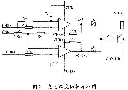為了確保充電時的安全性和延長電池的使用壽命,電池的充電溫度應控制在O~45℃之間為宜。該系統(tǒng)采用一個負溫度系數(shù)的NTC溫度傳感器RES和一個2路比較器LM393來實現(xiàn)充電溫度保護,其原理圖如圖2所示:當充電溫度位于O~45℃之間時,LM393的兩路比較器輸出均為高阻態(tài),PNP型三極管Q1關斷,對充電電路不產(chǎn)生影響;隨著溫度的升高,RES阻值逐漸變小,當溫度大于45℃時,LM393下面一路比較器反轉,輸出低電平,通過二極管D6將Q1的B極拉低,Q1導通,充電MOS管QCHRl的G極C_QCHR被強制拉高,QCHRl關閉,停止充電;同樣,隨著溫度的降低,RES阻值逐漸變大,當溫度小于O℃時,LM393上面一路比較器輸出低電平,通過二極管D5將Q1導通,從而關閉QCHRl,停止充電。[page]