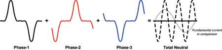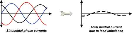 所有中性導(dǎo)線都并入配電板中的一個(gè)大直徑中性導(dǎo)線,就像一個(gè)變壓器一樣(見圖5)。在線性負(fù)載情況下,多相位系統(tǒng)的中性電流在一定程度上相互抵消。由于負(fù)載不平衡(見圖3),只有總中性電流的一小部分保留了下來(lái)。