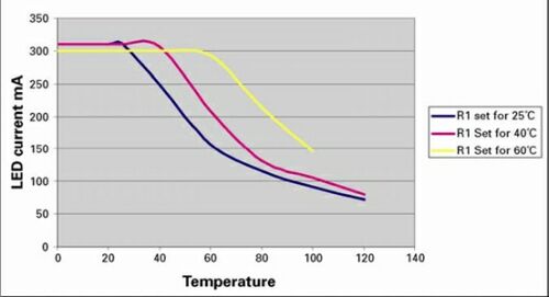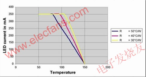 圖1中曲線顯示了1WLED的典型性能下降特性。正如所期望的那樣,這清楚地表明,被恒定電流驅(qū)動(dòng)的LED在到達(dá)某一點(diǎn)后,該恒流需要線性地減少,直到在150℃這一點(diǎn)上達(dá)到0。恒流下降點(diǎn)和減小斜率取決于機(jī)械/散熱安排。
