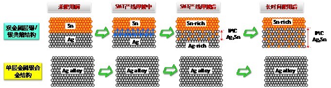圖7 單金屬層Ag合金結(jié)構(gòu)與雙金屬層Sn/Ag共熔結(jié)構(gòu),在SMT焊接前后及長時(shí)間使用后的材料與結(jié)構(gòu)變化示意圖。