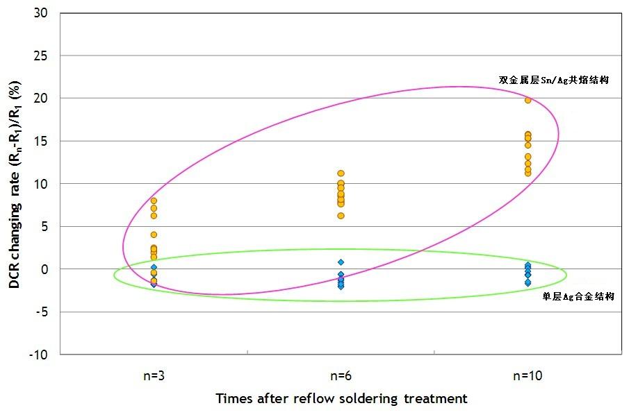 單層Ag合金結(jié)構(gòu)的保險(xiǎn)絲即使經(jīng)過多次高溫?zé)崽幚?,其冷阻抗變化很小。但是雙層Sn/Ag共熔結(jié)構(gòu)的保險(xiǎn)絲,其冷阻抗有明顯變高的趨勢(shì)(約升高10~20%),且變異也較大。
