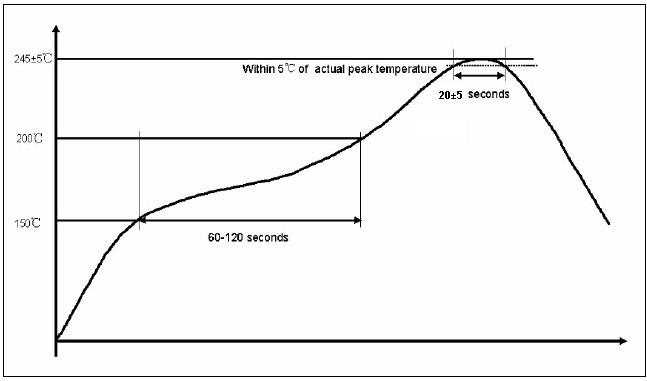 2.回流焊錫爐內(nèi)溫度條件(圖2),最高溫245±5?C/20±5秒,作業(yè)時(shí)間240±10秒。