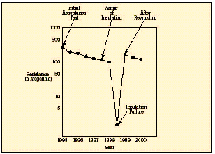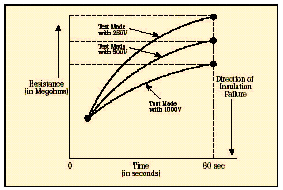 [page]在短時測試中,兆歐表被直接跨接在被測設備上,施加大約60秒的測試電壓。為了在大約一分鐘的時間內使絕緣值讀數達到穩(wěn)定,應該只對低容性的設備進行該項測試?;镜倪B接步驟和驗證測試時相同,所施加的電壓按DC測試電壓公式進行計算。當測試好的設備時,您會注意到,隨電容容量和吸收電流的降低,絕緣阻抗值會穩(wěn)定上升。由于溫度和濕度會影響測試結果,應該在標準溫度(大約20?C/68?F)下、露點之上的環(huán)境下進行測試。 當設備的額定值等于或小于1000伏特時,絕緣讀數應該為1MΩ或更高。當設備額定值高于1000伏特時,理想的阻抗應該為每1000伏特上升1MΩ。所測量的絕緣阻抗值通常會略低于以前記錄的值,其下降的趨勢規(guī)律如圖6所示。絕緣值下降的斜率是絕緣材料老化程度的正常信號。陡峭的下降斜率是絕緣失效或可能出現故障的先兆。