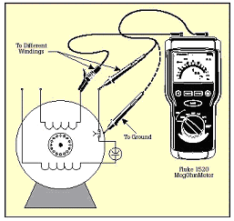 當測試定子馬口鐵的阻抗時,要確保定子繞組和定子相是斷開的。測量繞組之間以及繞組和地之間的絕緣電阻。還有,當測量DC發(fā)電機或馬達時,應該將電刷提高,這樣,就能將馬口鐵和電樞分開來測量。下表列出了推薦的在不同的馬達額定電壓下的最小阻抗讀數