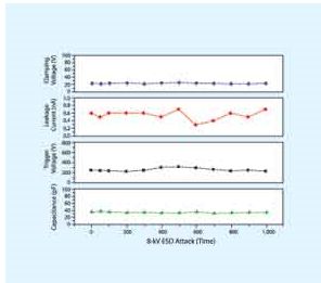 通過采用間隙技術(shù)(gap technology),特別是采用空氣作為間隙,已經(jīng)在低電容抑制器、更低漏電流、更低鉗位電壓等方面實(shí)現(xiàn)了可觀的性能提升。總之,在重復(fù)多次或持續(xù)的 ESD事件后,聚合物間隙抑制器會(huì)降級(jí),而空氣間隙器件仍將保持非常低的電容、漏電流和觸發(fā)電壓,即使在1s事件間隔內(nèi)經(jīng)過1000次ESD事件,也能保持良好的性能。