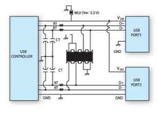 許多高速數(shù)據(jù)應(yīng)用和終端產(chǎn)品采用混合式保護(hù)方式,在數(shù)據(jù)和時(shí)鐘線上采用基于間隙的器件,在電源連接部分采用多層壓敏電阻或基于硅的瞬態(tài)電壓抑制二極管。例如,USB接口的D+和D–線要求高速保護(hù),這可以采用分立的芯片利用附加的多層壓敏電阻或瞬態(tài)電壓抑制器件用于VDD電源保護(hù)。PC、筆記本電腦、上網(wǎng)本等產(chǎn)品中常常需要多個(gè)USB接口連接。