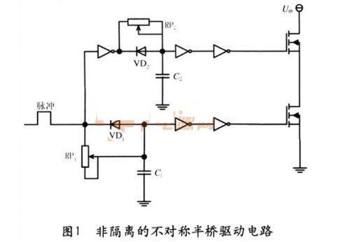 圖1為常用的小功率驅(qū)動(dòng)電路,簡(jiǎn)單可靠成本低,適用于不要求隔離的小功率開(kāi)關(guān)設(shè)備。其中一路直接接到下管,另外一路經(jīng)反向器反向后驅(qū)動(dòng)上管。RP1,RP2用于調(diào)節(jié)死區(qū)時(shí)間。