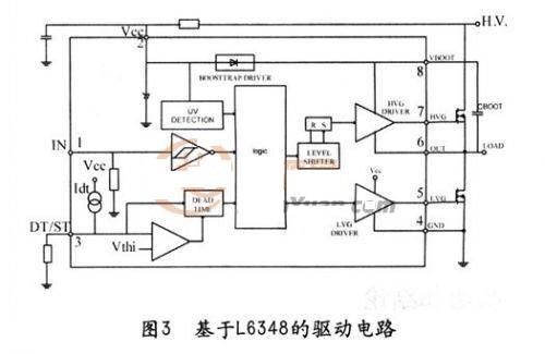 ST公司的L6384是專門的不對(duì)稱半橋驅(qū)動(dòng)芯片,其原理圖及外圍電路如圖3所示。單脈沖從1腳(IN)輸入,5腳(HVG)和7腳(LVG)輸出互補(bǔ)的脈沖。3腳(DT/ST)外接電阻和電容來(lái)控制兩路輸出的死區(qū)時(shí)間。當(dāng)3腳的電平低于0.5V的時(shí)候,芯片停止工作。專用芯片具有外圍電路簡(jiǎn)單、占用空間小的特點(diǎn),但由于其成本較高,不適用于低成本設(shè)計(jì)的產(chǎn)品