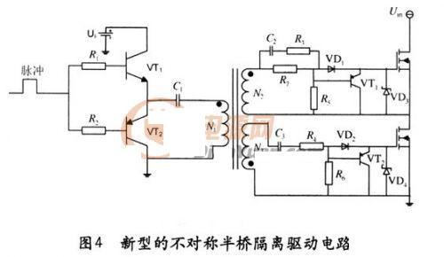 根據(jù)以上幾種驅(qū)動(dòng)電路,針對(duì)傳統(tǒng)隔離驅(qū)動(dòng)電路結(jié)構(gòu)復(fù)雜、占用空間大和不對(duì)稱半橋?qū)S眯酒?qū)動(dòng)電路應(yīng)用的局限性等問(wèn)題,提出了一種新型的不對(duì)稱半橋隔離驅(qū)動(dòng)電路,適用于單脈沖輸出的芯片,具有結(jié)構(gòu)簡(jiǎn)單可靠,占用空間小等特點(diǎn),并且實(shí)現(xiàn)了電氣隔離,可以運(yùn)用于中大功率場(chǎng)合。
