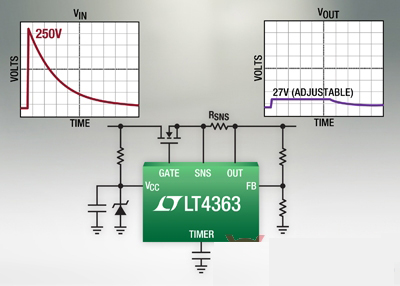 近日,凌力爾特公司推出過壓保護控制器 LT4363,該器件為高可用性電子系統(tǒng)提供了過壓和過流保護。當(dāng)流過長電感性電源總線的電流突然變化時,就會發(fā)生電源電壓浪涌。另外,汽車電池還會經(jīng)歷一種稱為負(fù)載突降的情況,在這種情況下,電壓會在持續(xù)多個 ms 的時間里處于上升狀態(tài)。傳統(tǒng)的保護電路依靠笨重的電感器、電容器、保險絲和瞬態(tài)電壓抑制器。而 LT4363 通過簡單地控制一個 N 溝道 MOSFET,實現(xiàn)了可靠、自適應(yīng)和節(jié)省空間的設(shè)計。只有控制器和 MOSFET 經(jīng)受高壓浪涌,下游組件可以提供較低電壓的額定值,因此節(jié)省了成本。