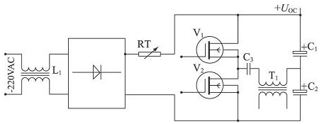 本系統(tǒng)開(kāi)關(guān)電源采用負(fù)溫度系數(shù)電阻組成的軟啟動(dòng)保護(hù)電路, 簡(jiǎn)單實(shí)用, 工作可靠。如圖1, 220 V 交流電經(jīng)線圈L1濾波共模干擾后, 整流產(chǎn)生約三百伏左右直流電壓, RT 電阻為負(fù)溫度系數(shù)熱敏電阻,型號(hào)為M02-7Ω。當(dāng)電源合閘瞬間, 浪涌電流使得熱敏電阻發(fā)熱, 阻值迅速減小, 輸出直流電壓逐漸建立,可有效防止浪涌電流對(duì)電源電路的沖擊, 使得整個(gè)電源半橋變換電路穩(wěn)定可靠。