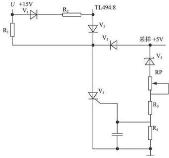 工作原理: 數(shù)控開(kāi)關(guān)電源由輔助電源+ 15 V 提供給可控硅V4管陽(yáng)極工作電壓, 實(shí)際輸出取樣電壓送至穩(wěn)壓管V5 , 當(dāng)超出保護(hù)電壓閾值+ 5. 5 V 時(shí), 輸出電壓經(jīng)穩(wěn)壓管、電阻R3 、R4 分壓觸發(fā)可控硅V4 導(dǎo)通, 將輔助電源+ 15 V 通過(guò)電阻R1接地, 同時(shí)通過(guò)二極管V2切斷8 腳電源。調(diào)節(jié)RP 電位器, 可以對(duì)輸出電壓保護(hù)閾值點(diǎn)進(jìn)行設(shè)置?! ?br />