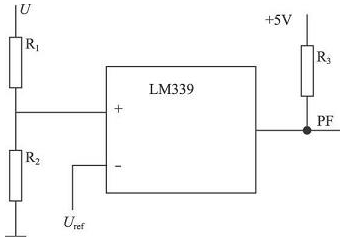 利用+ 5 V 及PF ( Power FAIL) 信號(hào)進(jìn)行比較, 在+ 5 V 掉電時(shí), PF 信號(hào)至少需維持10 ms 時(shí)間,以便存儲(chǔ)相關(guān)信息。欠壓保護(hù)電路如圖5 所示。