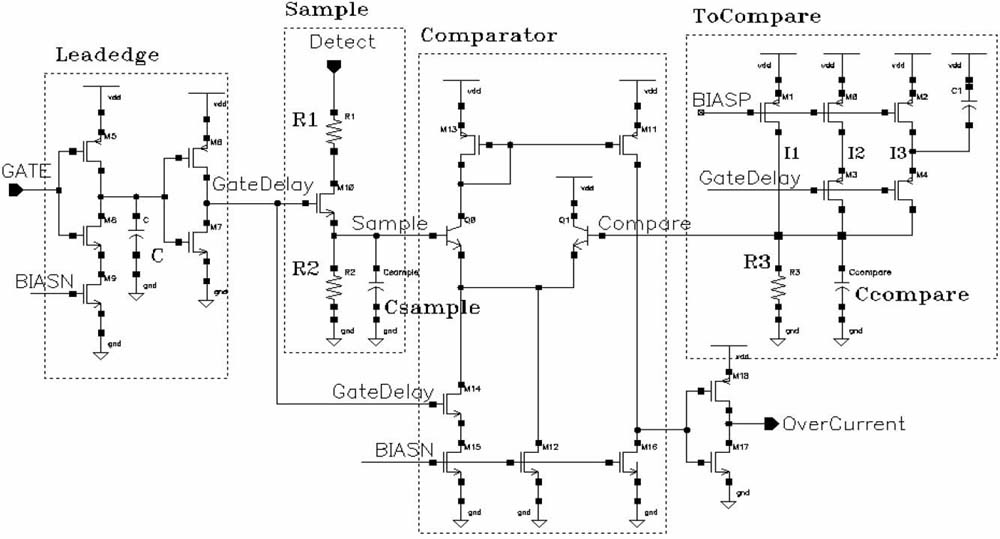 過(guò)流比較模塊主要由前沿消隱Leadedge、采樣電路Sample、比較電壓產(chǎn)生器ToCompare 和過(guò)流比較器Comparator 等組成,如圖3 所示。