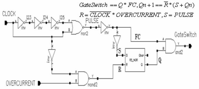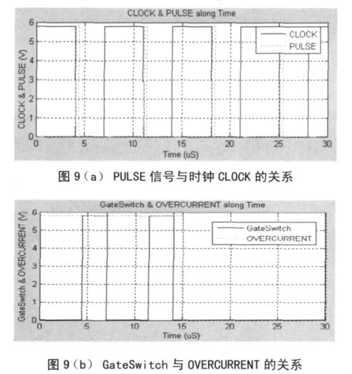 控制邏輯模塊如圖4 所示,該模塊直接控制LDMOS 的開(kāi)關(guān)。PULSE 信號(hào)的上升沿對(duì)應(yīng)是CLOCK 時(shí)鐘的開(kāi)始,PULSE 信號(hào)與時(shí)鐘CLOCK 的關(guān)系如圖9 所示。當(dāng)發(fā)生過(guò)流時(shí),OVERCURRENT信號(hào)為低,觸發(fā)器R 端為高,Q 為低,GateSwitch 信號(hào)為低,關(guān)斷LDMOS,從而實(shí)現(xiàn)過(guò)流保護(hù)功能。