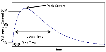 系統(tǒng)所經(jīng)歷的電氣應(yīng)力是各種各樣的: 有納秒上升時間且持續(xù)數(shù)以10計的安培電流的靜電放電(ESD)應(yīng)力;有微秒上升時間且持續(xù)數(shù)以萬計的安培電流的閃電應(yīng)力。對可以想到的現(xiàn)實世界中的每一種應(yīng)力都進行產(chǎn)品測量是不可能的。所以標(biāo)準(zhǔn)機構(gòu)制定了針對每個特定的應(yīng)力威脅制定了專門的測試標(biāo)準(zhǔn)。這些標(biāo)準(zhǔn)以電壓和電流波形的形式來表示應(yīng)力。最常見的一種應(yīng)力波形就是圖示的雙指數(shù)波形。典型的電壓波型是被理解成開路,而典型的電流波型是被理解為短路。通常一個波形的參數(shù)包括峰值電壓、峰值電流、上升時間(通常是峰值時間的10%到90%)以及衰減時間(峰值時間的50%)。標(biāo)準(zhǔn)同樣規(guī)定了如何把應(yīng)力波形應(yīng)用到實際的被測試的設(shè)備以及通過或者未通過測試的準(zhǔn)則。這就確保了測試結(jié)果可以被任何一個做此種測試的人重現(xiàn)出來,并且通過這個測試的系統(tǒng)可以可靠地工作。