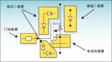 突出顯示的元件組成一個特性板,可以將其中的功能集成到MOSFET中。這些元件從右上角開始按順時針方向為:溫度感應二極管、電流傳感器、鉗位二極管(內部二極管,未顯示)和門電阻器。通過加入鉗位二極管和門電阻器眾所周知的保護特性,可以保護對電壓敏感的柵氧化層免受危險電場的破壞。