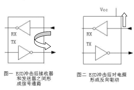 某些RS-232 接口電路中的ESD 保護(hù)結(jié)構(gòu)經(jīng)過ESD 沖擊后可能在輸入端與供電電源Vcc之間形成電流通路圖二對其供電電源產(chǎn)生反向驅(qū)動如果供電電源沒有吸入電流的能力通常來講電源輸出回路里有一個正向二極管這將導(dǎo)致電源電壓Vcc 的增加從而損