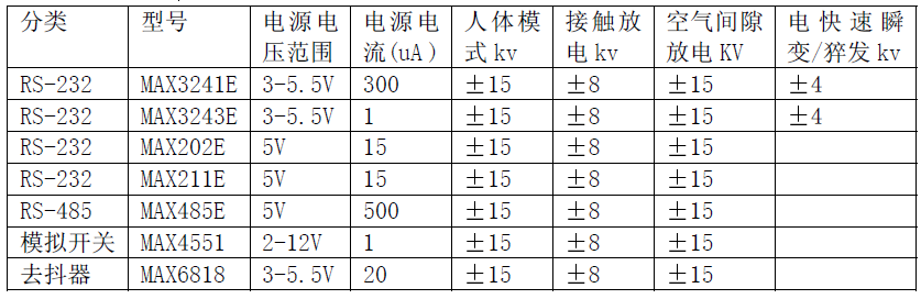 收的COM 端口需要8 個TransZorb?二極管費(fèi)用高達(dá)$2一種有效的方法是采用內(nèi)部集成ESD 防護(hù)功能的串行接口器件這種器件比普通無防護(hù)功能的器件價格要貴但增加的費(fèi)用比起外加防護(hù)二極管的費(fèi)用要低內(nèi)部集成的ESD,防護(hù)電路不會增加任何輸入輸出管腳的等效電容也節(jié)省了電路板面積MAXIM公司近幾年發(fā)展了享有專利的集成ESD防護(hù)技術(shù)并可提供全系列的ESD防護(hù)串行接口器件包括與標(biāo)準(zhǔn)器件完全兼容的產(chǎn)品MAXIM公司還將同樣的技術(shù)應(yīng)用到模擬開關(guān)和開關(guān)去抖產(chǎn)品中所有這些器件的ESD 防護(hù)能力都符合15kV IEC1000-4-2 氣隙放電8kVIEC1000-4-2 接觸放電15kV人體模型HBM 測試標(biāo)準(zhǔn)下表是MAXIM公司具有抗靜電功能的器件。