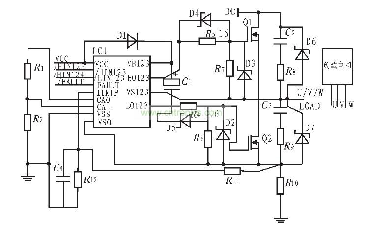 圖3是由IR2130組成的無刷直流電機驅(qū)動原理圖為便于表示只畫出其中一個橋臂的電路示意圖,通過IR2130輸入信號控制MOSFET的開關(guān),由此驅(qū)動無刷直流動機。C1是自舉電容,為上橋臂功率管驅(qū)動的懸浮電源存儲能量,D1的作用是防止上橋臂導(dǎo)通時母線電壓倒流到IR2130的電源上而使器件損壞,因此D1應(yīng)有足夠的反向耐壓,當(dāng)然D1與C1串聯(lián)也是為了滿足主電路功率開關(guān)頻率的要求,D1應(yīng)選快速恢復(fù)二極管。 R1、R2、R10、R11、R12、C4組成過流檢測電路。R5、R6為柵極驅(qū)動電阻,D4、D5為功率管提供了一個低阻抗的放電回路,使功率管能夠快速的泄放電荷。