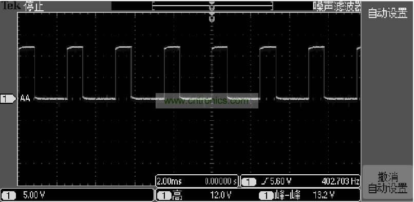 在實際應(yīng)用中柵極的驅(qū)動波形如圖4所示,此波形是在電機3000RPM時的驅(qū)動波形,可以看出此波形完全能夠滿足要求,同時進行了短路、電機堵轉(zhuǎn)等試驗,圖3電路也能過很好地保護功率MOSFET管。