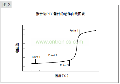 當電流或環(huán)境溫度再提高時,PolySwitch器件會達到一個較高的溫度如圖Point 3所示。若此時電流或環(huán)境溫度繼續(xù)增加,產(chǎn)生的