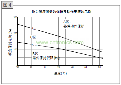 圖4說明了作為溫度函數(shù)的PolySwitch器件的保持和動作電流行為??梢詾槊總€可用器件定義一條這樣的曲線。A區(qū)說明了PolySwitch器件將動作 (轉(zhuǎn)到高電阻狀態(tài)) 以保護電路時的電流和溫度的組合。B區(qū)說明了PolySwitch器件將允許電路正常操作的
