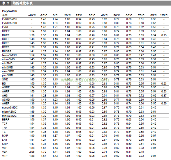 使用折減比率[環(huán)境溫度(℃)的保持電流(A)]表并選擇與電路最大環(huán)境溫度最匹配的溫度。瀏覽該欄以查閱等于或大于電路標準操作電流的值。現(xiàn)在查看該行的最左邊,查閱最適于該電路的器件系列。
