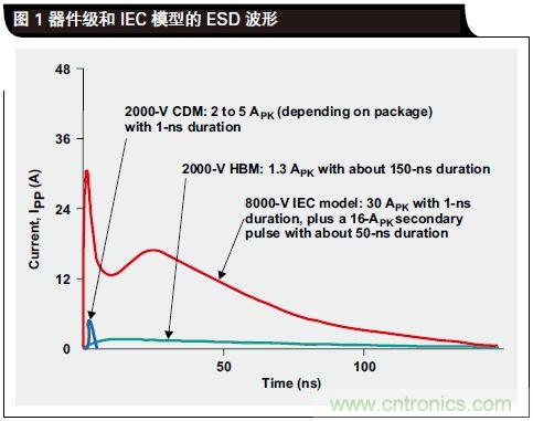 2、另一個(gè)差異存在于電壓尖峰上升時(shí)間。HBM 的規(guī)定上升時(shí)間為 25ns。IEC 模型脈沖上升時(shí)間小于 1ns,其在最初3ns 消耗掉大部分能量。如果 HBM 額定的器件需 25ns 來(lái)做出響應(yīng),則在其保護(hù)電路激活以前器件就已被損壞。