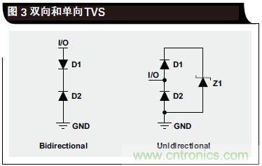 立即沿這條通路接地。在單向 TVS 情況下,只要 D2 和Z1 都不進(jìn)入其擊穿區(qū)域,則電壓信號(hào)會(huì)在接地電壓以上擺動(dòng)。當(dāng)正ESD電擊擊中I/O線路時(shí),D1變?yōu)檎蚱?,而Z1 先于 D2 進(jìn)入其擊穿區(qū)域;通過(guò) D1 和 Z1 形成一條接地通路,從而讓 ESD 能量得到耗散。當(dāng)發(fā)生負(fù)ESD 事件時(shí),D2 變?yōu)檎蚱茫珽SD能量通過(guò) D2接地通路得到耗散。由于 D1 和 D2 尺寸可以更小、寄生電容更少,單向二極管可用于許多高速應(yīng)用;D1 和 D2 可以“隱藏”更大的齊納二極管 Z1(大尺寸的原因是處理?yè)舸﹨^(qū)域更多的電流)。