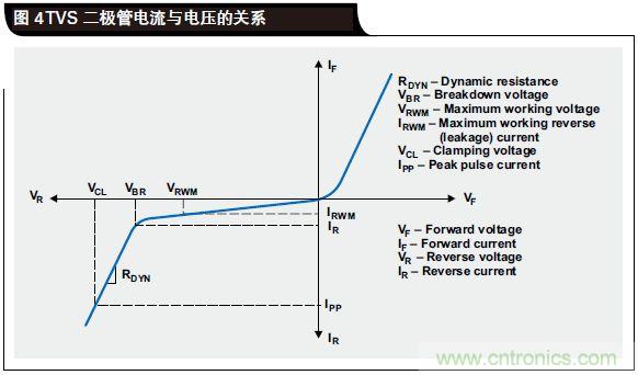 圖 4 顯示了 TVS 二極管電流與電壓特性的對(duì)比情況。盡管 TVS 是一種簡(jiǎn)單的結(jié)構(gòu),但是在系統(tǒng)級(jí) ESD 保護(hù)設(shè)計(jì)過(guò)程中仍然需要注意幾個(gè)重要的參數(shù)。這些參數(shù)包括擊穿電壓 VBR、動(dòng)態(tài)電阻 RDYN、鉗位電壓 VCL 和電容。