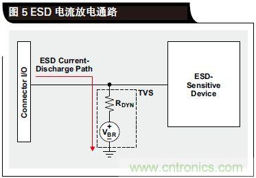 ESD 是一種極速事件,也就是幾納秒的事情。在如此短的時(shí)間內(nèi),TVS 傳導(dǎo)接地通路不會(huì)立即建立起來(lái),并且在通路中存在一定的電阻。這種電阻被稱作動(dòng)態(tài)電阻(RDYN),如圖 5 所示。