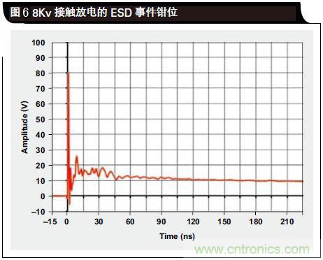 由于ESD是一種極速瞬態(tài)事件,I/O路線的電壓不能立即得到鉗制。如圖6所示,根據(jù)IEC 61000-4-2標(biāo)準(zhǔn),數(shù)千伏電壓被鉗制為數(shù)十伏。如方程式1所示,RDYN越小,鉗位性能也就越好:其中,IPP為ESD事件期間的峰值脈沖電流,而Iparasitic為通過(guò)TVS接地來(lái)自連接器的線路寄生電感。