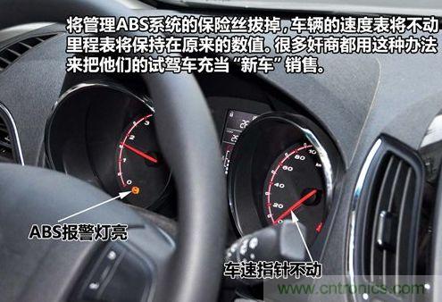 當(dāng)您新購買車的時候發(fā)現(xiàn)車輛的里程表和車速表不工作時要注意了,因?yàn)楹芸赡苁羌樯贪涯囕v管理ABS泵的保險(xiǎn)絲給拆下來了,這樣車輛還能正常開但里程數(shù)不增加,而這也是很多奸商翻新試駕車后當(dāng)新車賣的常用手段。