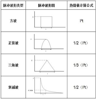 表2是幾種常見(jiàn)脈沖波形的計(jì)算公式。脈沖電流的熱熔值可以通過(guò)對(duì)脈沖電流波形數(shù)據(jù)的積分計(jì)算得到。