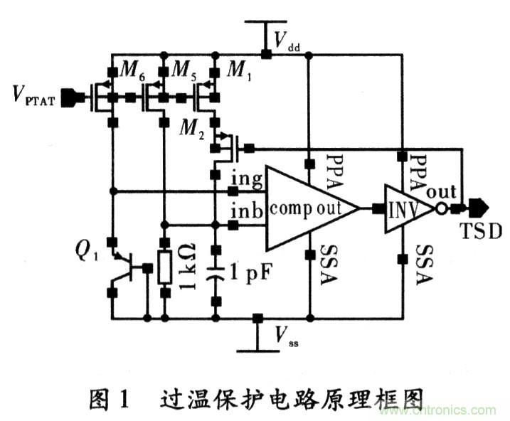 圖1為本設(shè)計的原理架構(gòu),Q1為NWELLCMOS工藝中寄生PNP三極管,其集電極是必須與地點位連接,為了利用寄生PN結(jié)導(dǎo)通正向?qū)妷旱呢摐囟忍匦?,把Q1做二極管連接(基集也接到地),這樣A點和地之間的電壓VA就具有了PN結(jié)正向電壓的與溫度成反比的性質(zhì)。由于基準(zhǔn)電路輸出的偏置電壓加在M0、M1、M5的柵極上,則其所在支路上都會產(chǎn)生PTAT電流(Proportional to Abso-lute Temperature);在提供偏置的同時,也在電阻R0上產(chǎn)生了與溫度成正比的電壓VB即B點電壓隨之增大。當(dāng)達到某一溫度TH(設(shè)定的關(guān)斷溫度)后,VH≥VA、比較器Comp輸出高電平,經(jīng)過倒相器INV后,輸出TSD為低電平;此信號作用于電路的其它模塊后,使整個芯片停止工作,實現(xiàn)熱保護功能。同時,TSD信號正反饋作用于M2柵上,開啟M2,加大了電阻R0上電流,使VB更高。