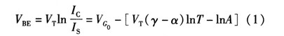 式中VG為帶隙電壓,γ和α為器件參數(shù),A代表了那些方程推到過程中與溫度無關(guān)的常量。因為Vt=kt/q,可以得到VBE隨溫度上升是降低的。其關(guān)于溫度變化的方程為