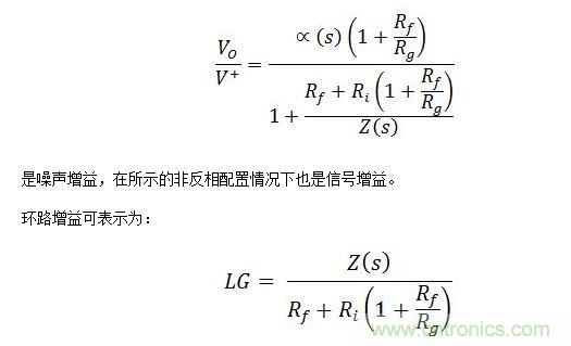 這對(duì)于理想的CFB[Ri=0]來說,是一個(gè)非常重要的公式,因?yàn)樗砻髁谁h(huán)路增益與反饋電阻的比例關(guān)系,因此反饋電阻可作為CFB的主要補(bǔ)償。事實(shí)上,增加反饋電阻及帶寬(BW),不僅會(huì)降低反饋電阻,同時(shí)還可增大帶寬。實(shí)際上,不可能將反饋電阻降低到特定值以下,否則放大器會(huì)發(fā)生振蕩。
