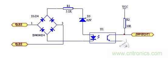 當沒有振鈴信號時,線路上的供電電壓為48V(部分交換機為60V),經(jīng)四個二極管構(gòu)成的全橋整流后,不足以使62V穩(wěn)壓管導(dǎo)通,振鈴信號輸出端電壓接近0V,當振鈴信號到來時,線路上的90V交流振鈴信號經(jīng)全橋整流變換后90V的脈動直流電,其峰值足以擊穿耐壓值為62V穩(wěn)壓管,經(jīng)電阻R1給U1提供電壓,從光電耦合器輸出的波形是 時通時斷的方波方波信號,可以直接輸出至單片機的中斷輸入口, CPU可以根據(jù)振鈴信號光電轉(zhuǎn)換后的高低電平檢測有無振鈴。