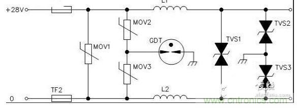 采用常規(guī)的兩級設計方式,第一級用來吸收較大的浪涌,后級采用TVS來對殘壓進一步的吸收。第一與第二級之間采用電感進行退耦,起到延時的作用,這樣可以保證MOV可以比TVS先動作。u 前級共模采用壓敏與氣體管相結合的方式;u 前級差模采用壓敏、溫度保險相結合的方式,溫度保險可以消除壓敏失效短路時火災的發(fā)生。