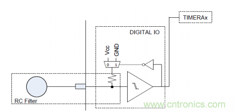MSP430根據(jù)型號的不同支持多種電容觸摸檢測方式,有RC 震蕩、比較器、PIN RO,本設(shè)計使用的是PIN Relaxation Oscillator 方式,原理如圖,芯片管腳內(nèi)部檢測電路由施密特