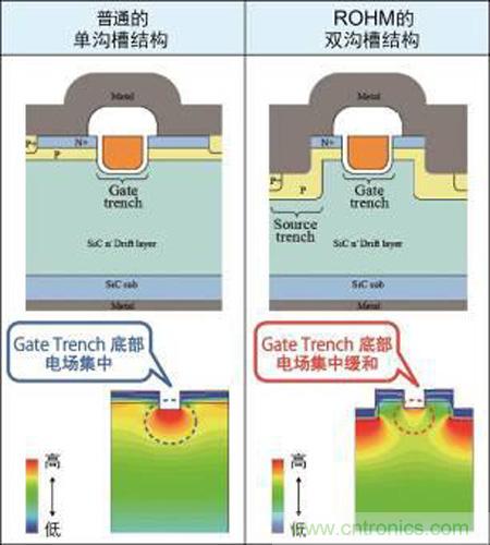 溝槽結(jié)構(gòu)因在SiC-MOSFET中采用,可有效降低導通電阻而備受關(guān)注。但為了確保元器件的長期可靠性,需要設(shè)計能夠緩和Gate Trench部分(通過有無施加電壓來控制MOSFET元件的開關(guān)ON/OFF的部位)產(chǎn)生的電場的結(jié)構(gòu)。因為當僅在Gate Trench部位采用溝槽結(jié)構(gòu)時,Gate Trench結(jié)構(gòu)底部電場集中,很難確保元器件的可靠性。ROHM通過采用獨創(chuàng)的結(jié)構(gòu),緩和了Gate Trench結(jié)構(gòu)底部的電場集中現(xiàn)象,從而成功實現(xiàn)了采用溝槽結(jié)構(gòu)的SiC-MOSFET的量產(chǎn)(圖6)。