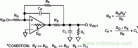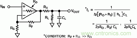在運(yùn)放的輸出端和負(fù)載電容之間串入一個(gè)電阻RX,一般而言它的阻值為10-100歐姆。