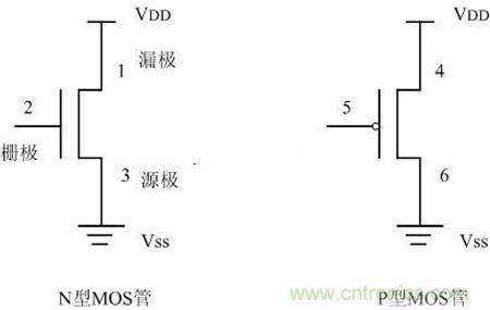 以N型管為例,2端為控制端,稱為“柵極”;3端通常接地,稱為“源極”;源極電壓記作Vss,1端接正電壓,稱為“漏極”,漏極電壓記作VDD。要使1端與3端導(dǎo)通,柵極2上要加高電平。