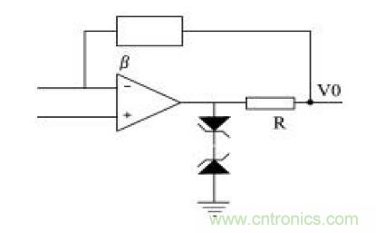 (3)輸出保護(hù)。當(dāng)集成運(yùn)放過(guò)載或輸出端短路時(shí),若沒(méi)有保護(hù)電路,該運(yùn)放就會(huì)損壞。但有些集成運(yùn)放內(nèi)部設(shè)置了限流保護(hù)或短路保護(hù),使用這些器件就不需再加輸出保護(hù)。對(duì)于內(nèi)部沒(méi)有限流或短路保護(hù)的集成運(yùn)放,可以采用下圖所示的輸出保護(hù)電路。在下圖電路中,當(dāng)輸出保護(hù)時(shí),由電阻R起限流保護(hù)作用。