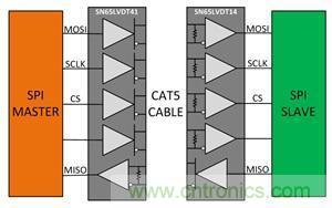 SN65LVDT41和SN65LVDT14的架構(gòu)可以使整條SPI總線轉(zhuǎn)化為支持LVDS:同一方向上用于MOSI,SCLK和CS信號(hào)的4個(gè)收發(fā)器,相反方向上用于MISO信號(hào)的1個(gè)收發(fā)器。LVDS芯片組也具有內(nèi)置端接帶來(lái)的額外優(yōu)勢(shì),應(yīng)用簡(jiǎn)單,還可以減少電路板空間本就非常寶貴的應(yīng)用中的組件數(shù)量。圖2顯示的是使用上述芯片組的一個(gè)已擴(kuò)展SPI總線架構(gòu)的組成結(jié)構(gòu)。這個(gè)實(shí)現(xiàn)方式并不要求必須使用5類(lèi)屏蔽雙絞線(STP),但是如果使用此類(lèi)線纜的話,會(huì)使這種架構(gòu)的實(shí)現(xiàn)方式更加簡(jiǎn)單。