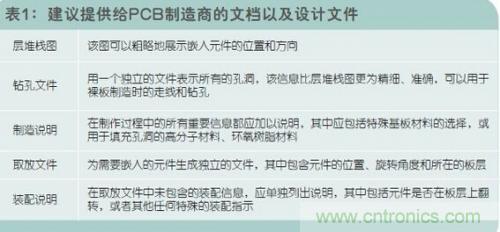 在設(shè)計嵌入元件時,為了確保成功無誤,重要的一點是與PCB制造商充分的溝通,表1中羅列出了建議提供給PCB制造商的文檔以及設(shè)計文件。