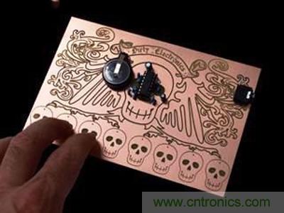 接著是跟前面的街頭涂鴉風(fēng)格完全不同的另一款迷你合成器電路板;電路板上并列的那一排骷髏是合成器的鍵盤,振蕩器(oscillator)的間距是由皮膚接觸的電平來控制。事實(shí)上,玩這個(gè)小東西的秘訣是,在開始彈奏之前先舔一舔(?!)指尖…